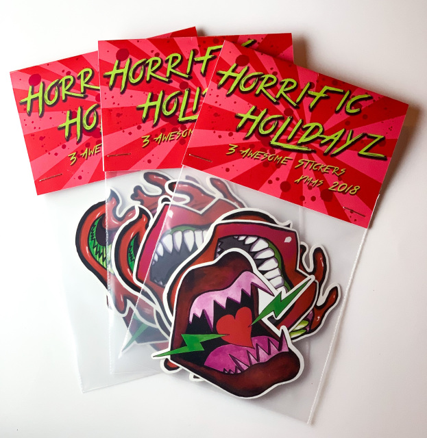 Support WOLF LUV FILMS this Holiday season with our HORRIFIC HOLIDAYZ Sticker Pack! Buy One! Buy Three!! These are quality vinyl 3" slaps, scratch and weatherproof and ready to rock on all your favorite things. Each package comes with one each of all three of our 2018 xmas-inspired spooky mouth designs.
